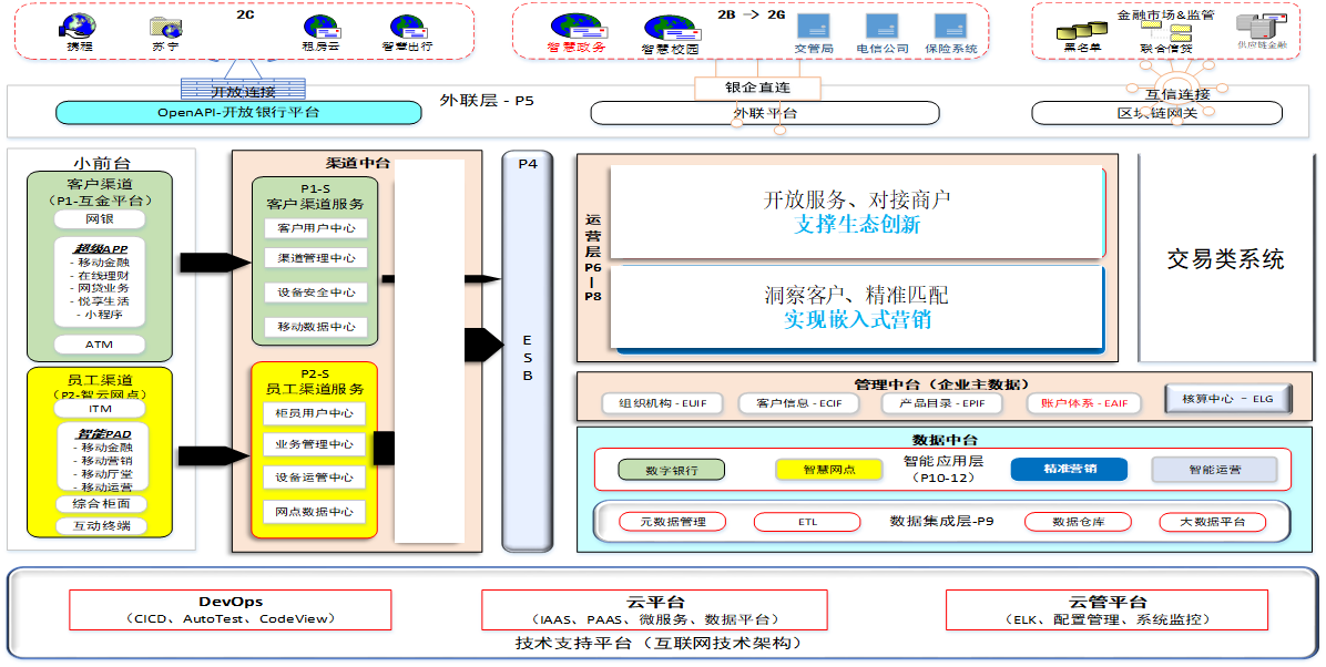 建設(shè)銀行P1平臺(暨客戶渠道平臺)是在新一代銀行“企業(yè)建模、頂層設(shè)計”的總體規(guī)劃下,整合電子渠道業(yè)務(wù),規(guī)范前端技術(shù)架構(gòu),開放渠道服務(wù),打造智能化的自助渠道業(yè)務(wù)運(yùn)營體系。系統(tǒng)涵蓋
