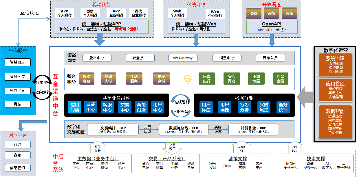 銀行互聯(lián)網(wǎng)渠道的協(xié)同與服務(wù)平臺,集成業(yè)務(wù)中臺和數(shù)據(jù)中臺為樞紐的能力中心。